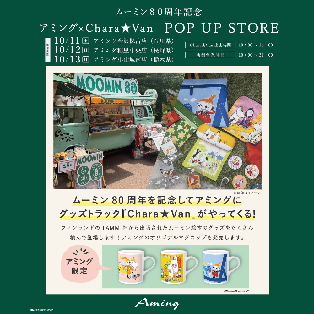 移動販売車グッズトラック「Chara★Van」(キャラヴァン)が10/11(土)からの三連休にAming(アミング)3店舗を巡回して出店♪フィンランドのTAMMI社の絵本アートを使用した「ムーミン」のオリジナルグッズを販売!アミング限定マグカップもご用意しています♪