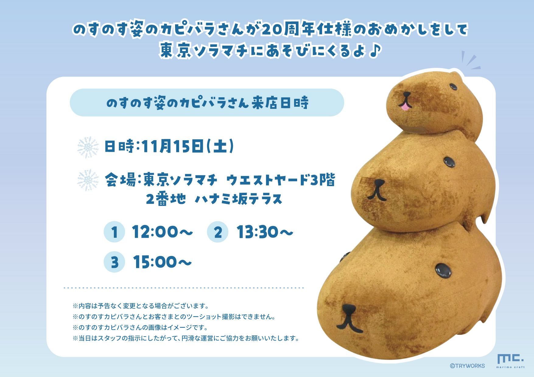 カピバラさんの期間限定ショップを11/1(土)より東京ソラマチ 3Fにて開催!税込2,200円以上のお買上でポストカードを1枚プレゼント!イベント限定商品や先行販売商品をご用意しています♪
