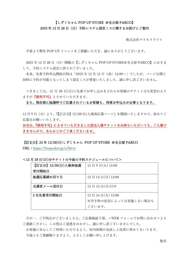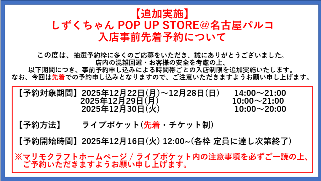 | 予約対象期間外日程の入場方法について | →12/24現在、上記日程以外はフリー入場となりますが、運営方法を変更させていただく場合がございます。 追加の案内がある場合は、マリモクラフトイベントX(@marimocraft_eve) からご案内いたします。 |