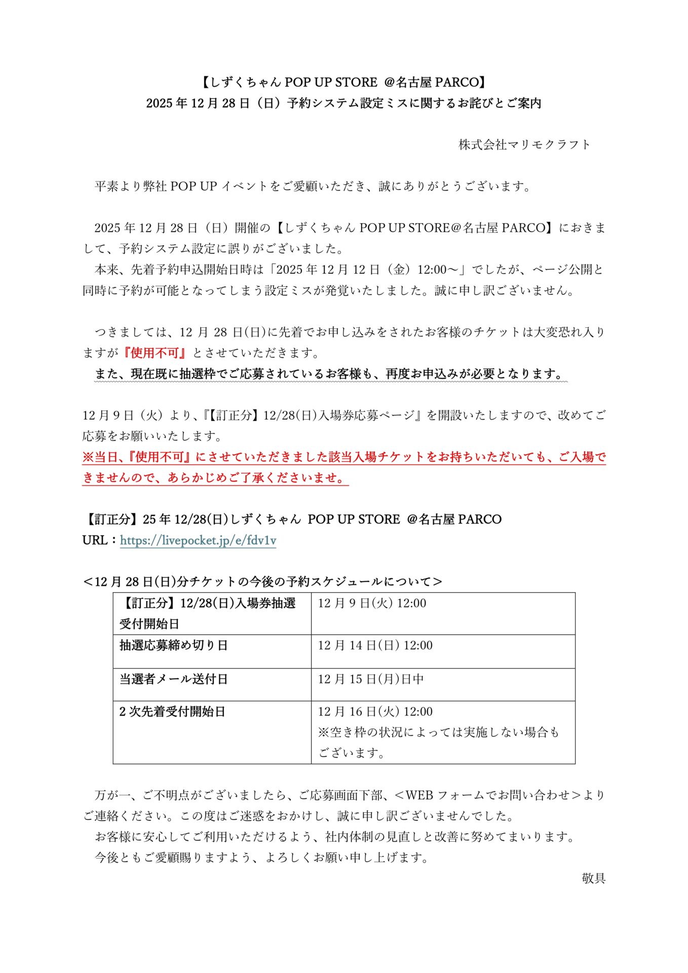 12/28(日)の入店事前予約については改めて下記URLよりお申込みいただきますようお願い申し上げます。
