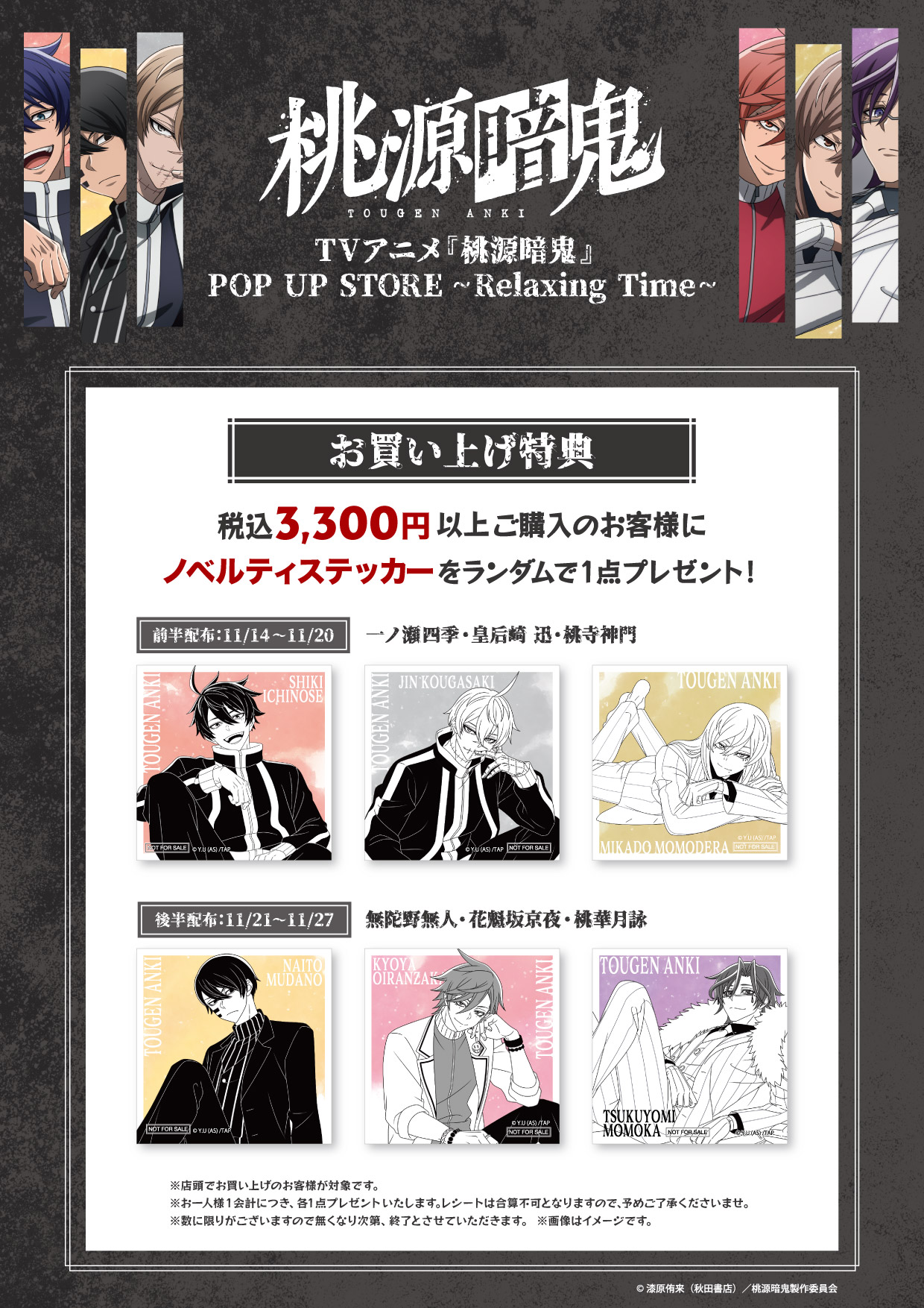 11/14(金)より、TVアニメ 『桃源暗鬼』のPOP UP STOREが東京キャラクターストリートに登場!描き起こしイラストを使用したイベント限定商品等を販売いたします!期間毎に異なるお買い上げ特典もご用意しております♪