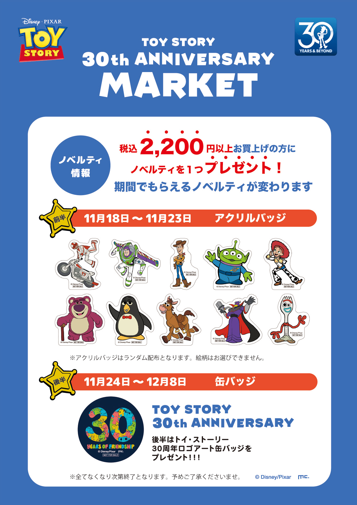 11/18(火)より『トイ・ストーリー』公開30周年を記念したポップアップストアを開催!イベント限定商品をご用意しております♪さらに、税込2,200円以上お買上げで期間によって異なるノベルティをプレゼント!
